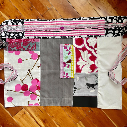 Cute patchwork half apron | featured in Somerset Studio | upcycled from thrifted & hand me down pants | unlined with a tie waist